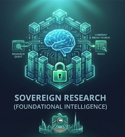 The four pillars around the brain below expand on sovereign research, knowledge governance, agentic operations, and infrastructure.